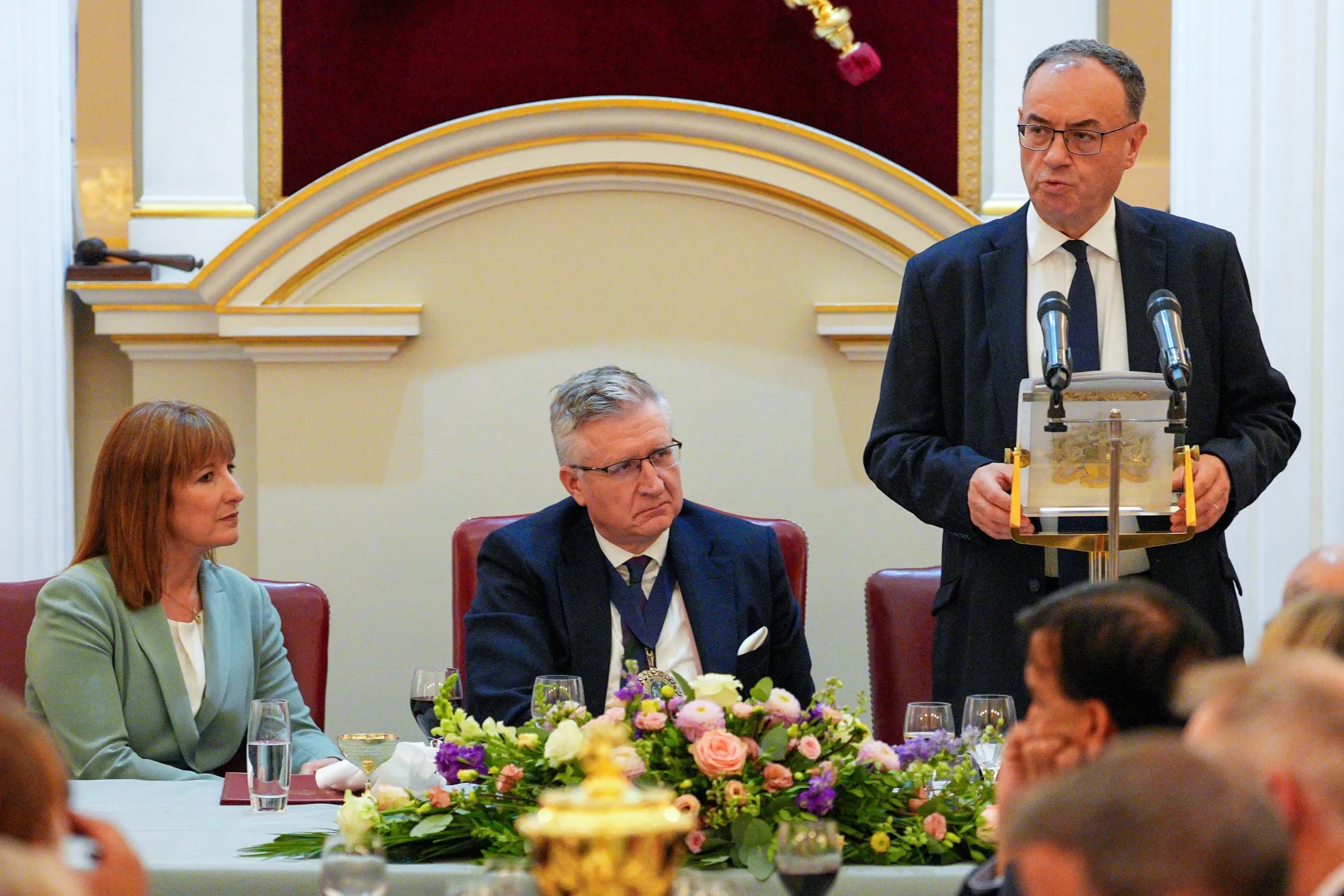 安德鲁·贝利,右,与拉切尔·里夫斯,左,以及阿拉斯泰尔·金,在2025年7月15日伦敦市的曼森大厦。摄影师:卡尔·库特/盖蒂图片社像许多英国财政大臣一样,拉切尔·里夫斯进入唐宁街时承诺振兴经济,但到目前为止未能产生太大变化。