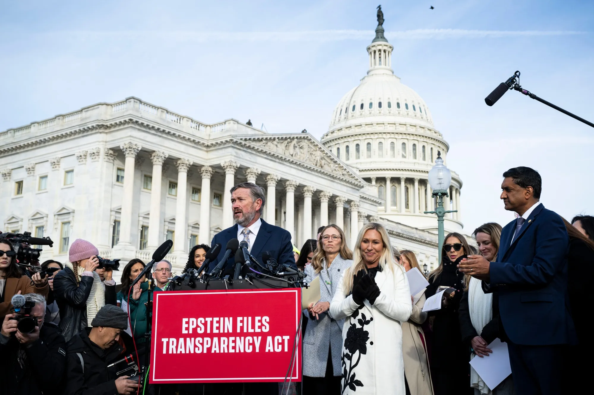 马西在11月18日美国国会大厦外的爱泼斯坦文件新闻发布会上发言。摄影师:Graeme Sloan/Bloomberg即使是该党通常温和的国会领导人——众议院议长迈克·约翰逊和参议院多数党领袖约翰·图恩——也存在分歧,图恩更愿意与特朗普对抗。