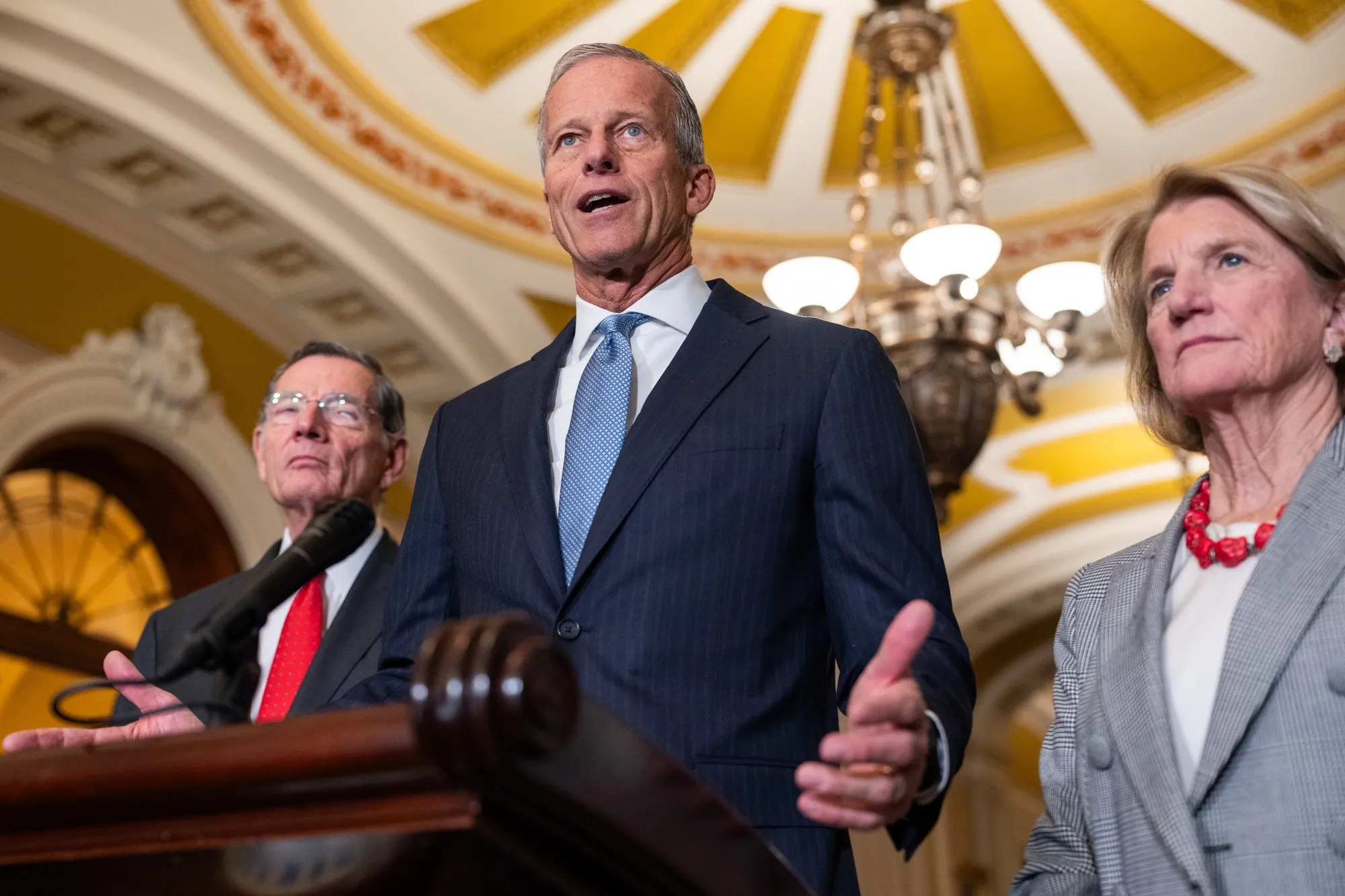 图恩在11月19日美国国会举行的每周参议院共和党政策午餐会后的新闻发布会上发言。摄影师:埃里克·李/彭博社约翰逊还表示他“非常生气”图恩在结束停摆的法案中插入了一项条款,这可能使一群共和党参议员在拜登政府期间因扣押他们的电话记录而从纳税人那里获得数百万美元的诉讼赔偿。