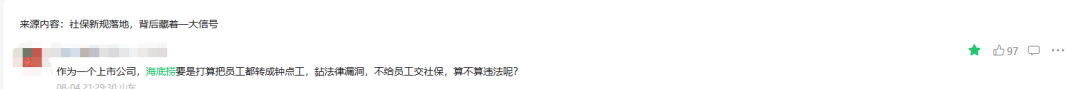 我们上周一的文章发了之后,就有海某捞员工留言说,公司打算把员工转化成钟点工来节省社保费。