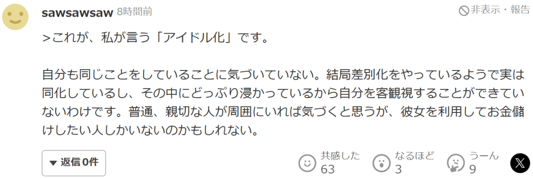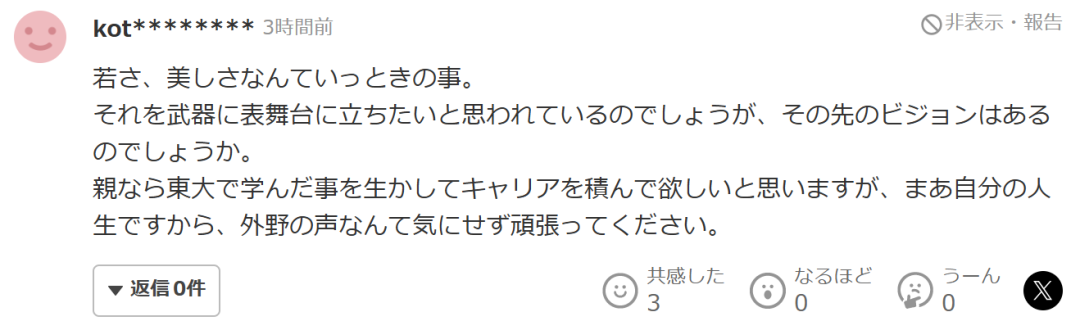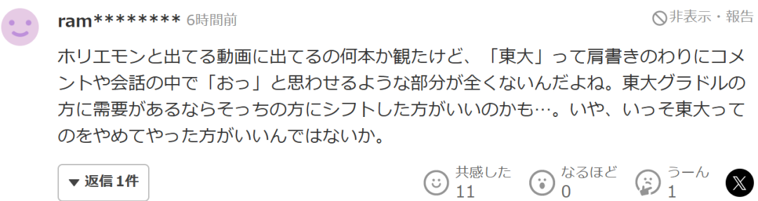 “我看过她跟堀江贵文一起共演过的几个视频,说实话,以东大这个头衔来说,她的发言和对话里完全没有让人眼前一亮的地方。要是真有观众需求的是东大写真偶像这个定位,那她倒不如干脆往那个方向转型。甚至,我觉得与其一直打东大这张牌,不如索性把东大的标签摘掉,或许还更自在。”