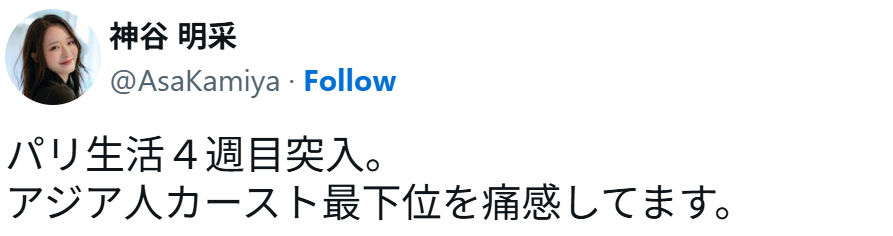 前往巴黎的原因也很简单,她觉得日本太小,视线会很狭隘。但在巴黎日子也不好过,她曾发文表示在海外深切感受到对亚裔的歧视。比如在地铁遭大声音乐骚扰被嘲笑,曾被袭击威胁,也遇到酒店刁难、座位被拒等情况。
