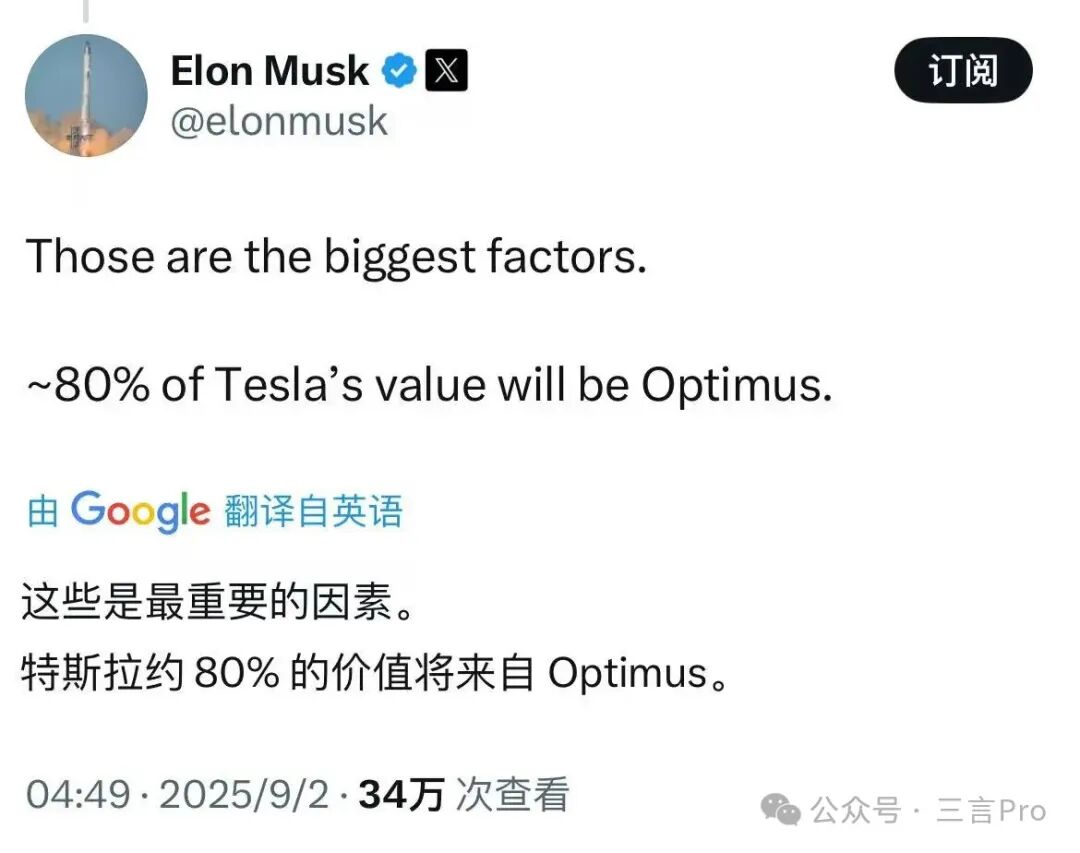 他表示,FSD和Optimus的规模化将是最为重要的事项,而未来特斯拉约80%的价值将来自Optimus机器人。