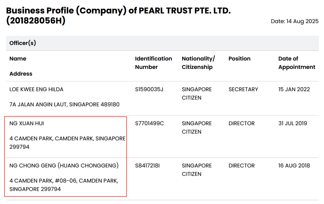 因此,我们调取了新加坡会计与公司监管局(ACRA)的信息。核实了指控中提及的,黄思绵子女与Refract Technologies、Pearl Trust PTE. LTD的持股信息。