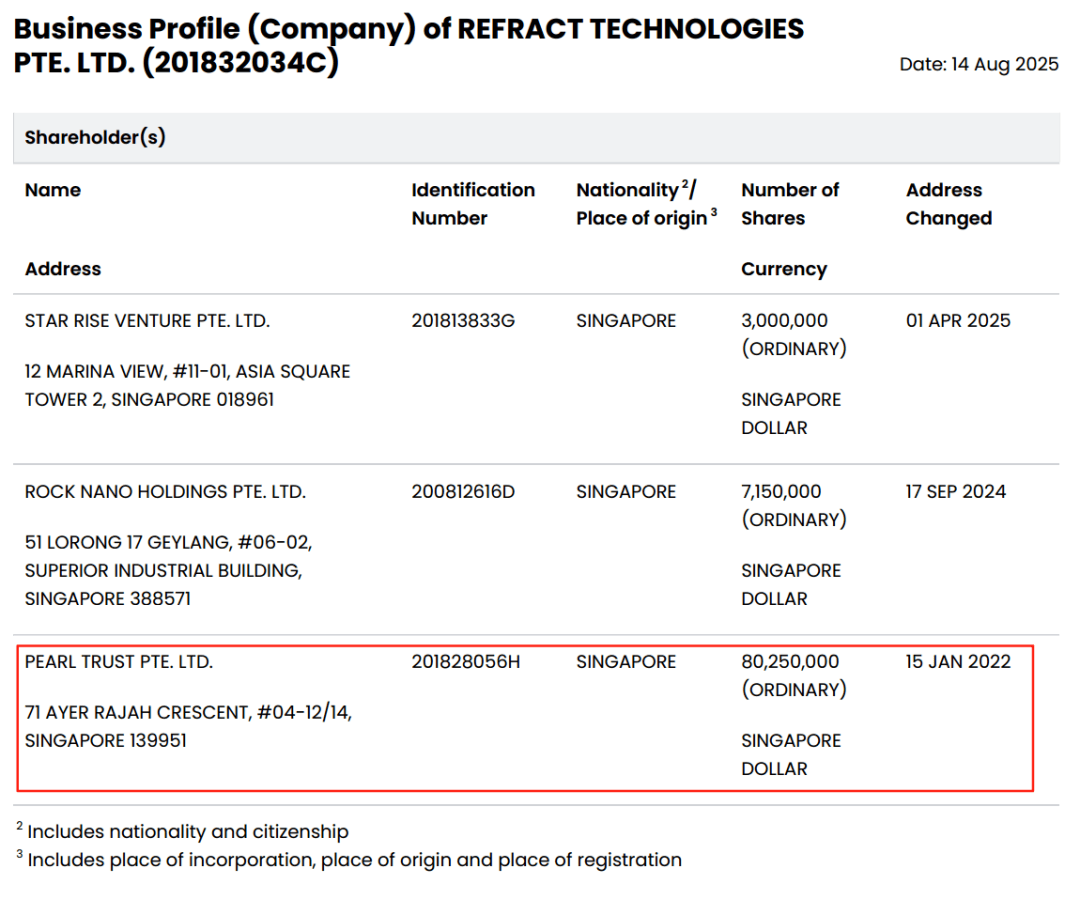 Refract Technologies公司成立于2018年9月18日,Pearl Trust则成立于2018年8月16日,两者均属成立于新加坡的私人控股公司。