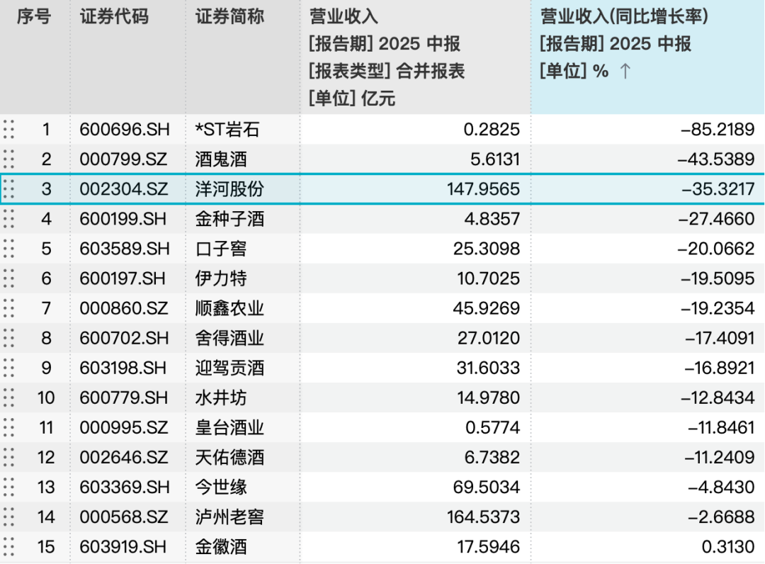 放到行业整体来看,洋河上半年的收入下滑幅度,只稍好于*ST岩石、酒鬼酒两家。而这两家公司不仅规模小,还都处于深度调整期。