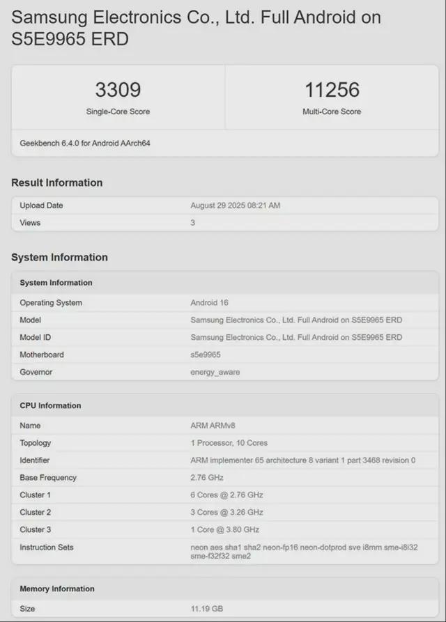 据业内人士透露,一款疑似三星下一代Exynos 2600的AP在Geekbench 6基准测试网站上获得了单核3309分、多核11256分的成绩。这些能够体现智能手机性能的分数,几乎与高通下一代骁龙8 Elite第二代AP(单核3393分、多核11515分)的成绩持平。此前,Exynos 2600在同一测试中的平均单核成绩为2575分,多核成绩为8761分,这意味着短期内性能有了显著提升。