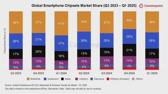 高通本季度出货量环比持平,市场份额为28%,稳居第二。表现主要由高端市场驱动,旗舰芯片Snapdragon 8 Elite获得多项设计采用。