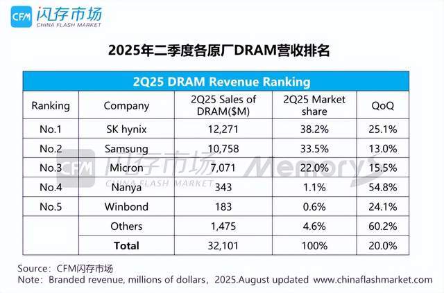 与此同时,SK海力士继续刷新自己在DRAM市场的优势,在2025年二季度以38.2%的市场份额再度蝉联第一,并扩大了与三星的差距。SK海力士二季度DRAM销售收入达122.71亿美元,环比增长25.1%,市场份额为38.2%,连续第二个季度位列DRAM市场第一。