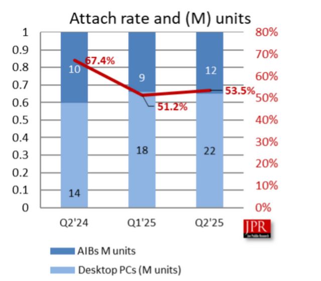 JPR 的报告指出,在 2024-2028 年的预测期内,AIB 的复合年增长率将为 - 5.4%。尽管增长率为负,但在此期间,独立 GPU 的安装量将达到 1.63 亿台,并且在未来五年内,预计 87% 的台式电脑将配备独立显卡。这一数据表明,即便未来几年行业整体出货量增长面临挑战,但随着游戏、专业工作负载和 AI 用例对高性能显卡的需求持续攀升,桌面 GPU 市场仍将保持相当的活跃度。