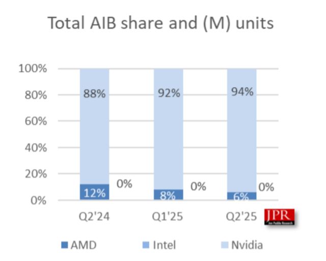 NVIDIA 再次在独立 GPU 市场份额上创下历史新高,目前其份额已达 94%,与之形成鲜明对比的是,AMD 在 2025 年第二季度的市场份额仅为 6%。这一数据来自 Jon Peddie Research(JPR)发布的完整的 2025 年第二季度独立(AIB)GPU 市场报告。该报告显示,独立 GPU 市场领域的总出货量较上一季度增长了 27%,与此同时,数据中心 GPU 板卡出货量也增长了 4.7%。