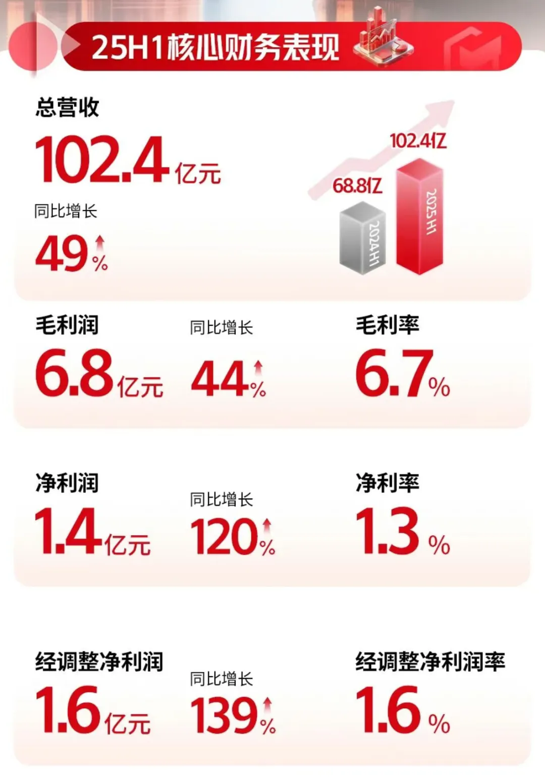 日前发布的中期业绩显示,顺丰同城营收同比增长48.8%至102.36亿元,半年度收入首次突破百亿;净利润增长120.4%至1.37亿元,创下历史新高;期内经调整净利润约1.6亿元,同比增长139.0%。