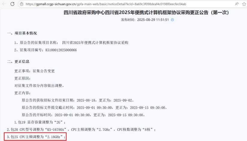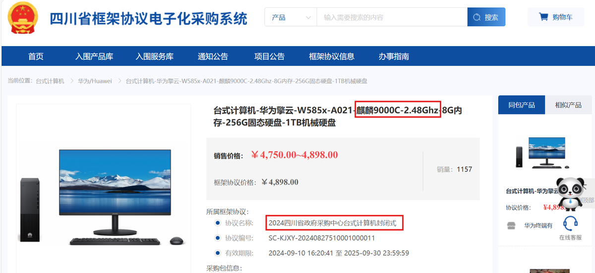 8月11日,四川省2025年台式计算机框架协议采购征集公告首次公布,麒麟9000C以2.3Ghz主频配置录入标包32。彼时有人发现,这与华为擎云系列原有的2.48Ghz配置明显不符。