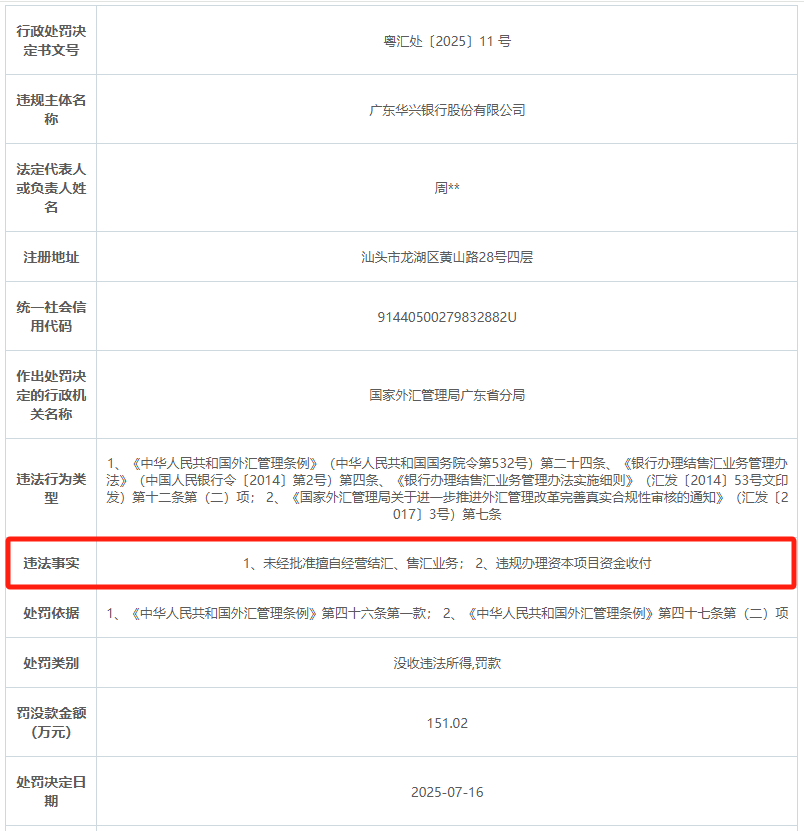 (图 / 2025年广东华兴银行的2项监管罚单(来源:国家外汇管理局广东省分局、金融监管总局汕头监管分局))