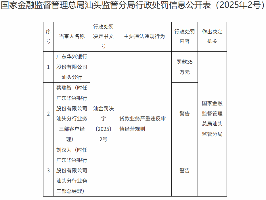 此前在1月底,金融监管总局汕头监管分局对于该行汕头分行开出罚单。因贷款业务严重违反审慎经营规则,对该行罚款35万元,同时对两名相关责任人给予警告。