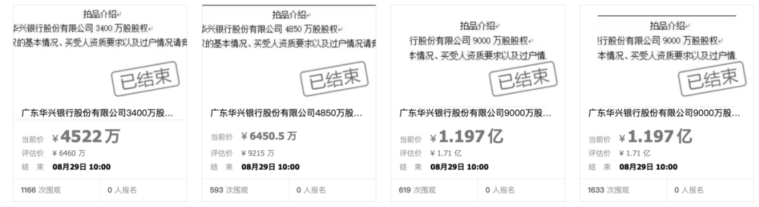 8月28日,广东华兴银行有4笔股权(合计2.6亿股股权)在阿里司法拍卖平台进行拍卖,拍卖价合计约3.5亿元。一天后拍卖结束,这四笔标的均处于“流拍”状态。