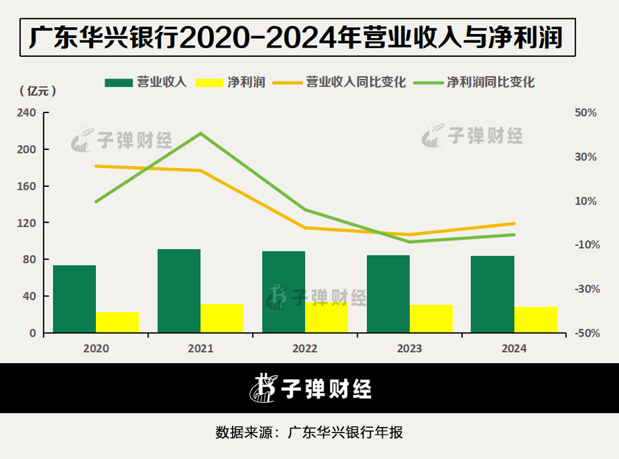 从业绩表现来看,截至2024年末,广东华兴银行的营业收入83.67亿元,同比减少0.49%;净利润28.52亿元,同比下滑5.56%。