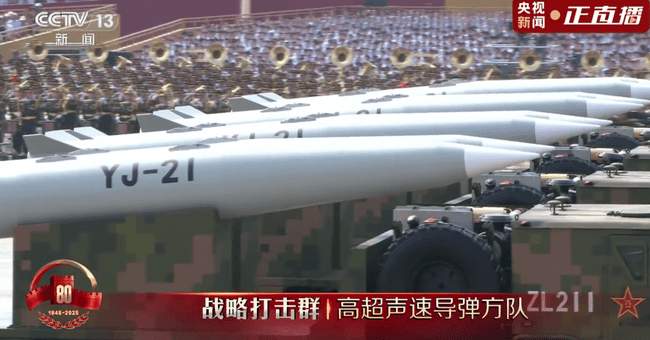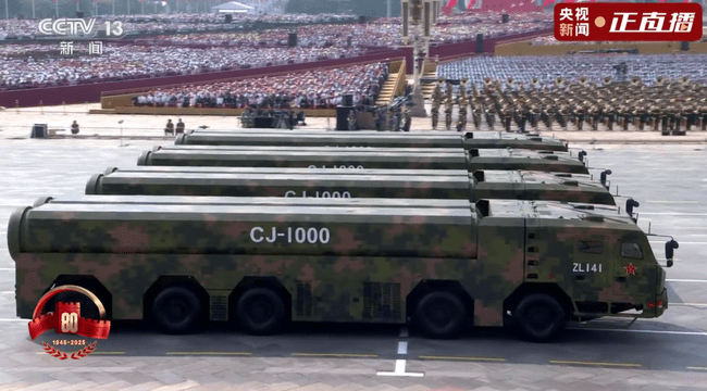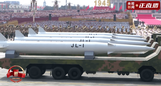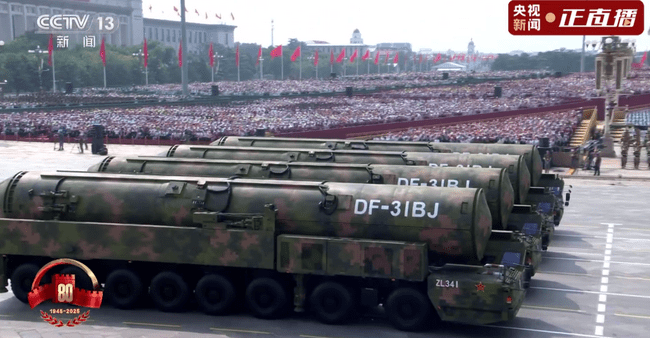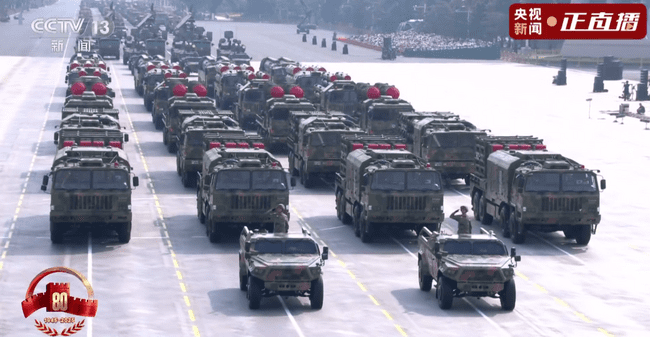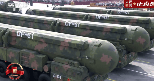 重点来了啊。第一个方队,陆、潜、空基三位一体战略核打击力量首度联袂登场,包括惊雷-1空基远程导弹、巨浪-3潜射洲际导弹,以及陆基的东风-31、东风-61……