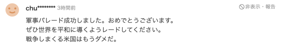 “阅兵式成功了。恭喜你们,请引导世界走向和平。打仗的美国已经不行了。”