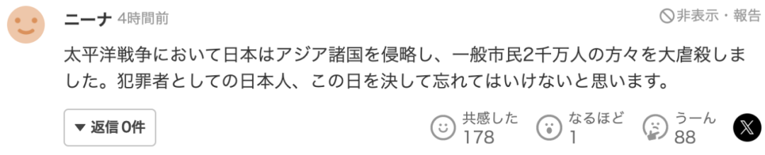 “太平洋战争中,日本侵略亚洲各国,屠杀了2000万普通市民。作为罪犯的日本人,绝对不会忘记这一天。”