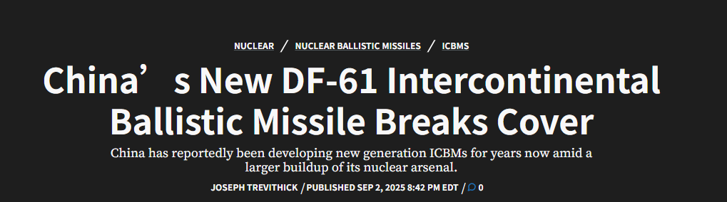 美国有线电视新闻网(CNN)就充满疑惑地猜测,突然出现的“东风-61”洲际导弹到底是什么?报道称,之前外界对于东风-61的认识,还停留在上世纪70年代——总部位于德国的和平研究与安全政策研究所称,东风-61 的名称此前最后一次出现在 1970 年代,当时中国正在开发一种液体燃料导弹,该计划于 1978 年被取消——显然与这次参加阅兵的“东风-61”无关。