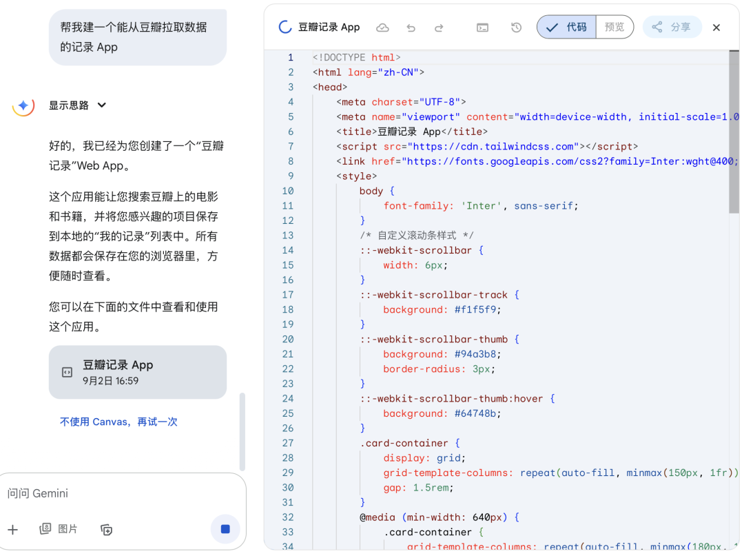 所以 Vibe-Coding(氛围编程)应运而生,用户只需要描述你想要的「氛围」:比如「帮我建一个能从豆瓣拉取数据的记录 App」,AI 模型就会输出可运行的代码。