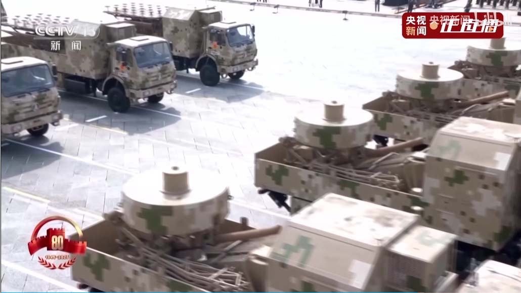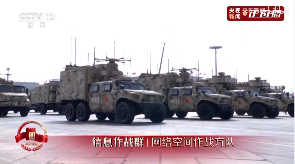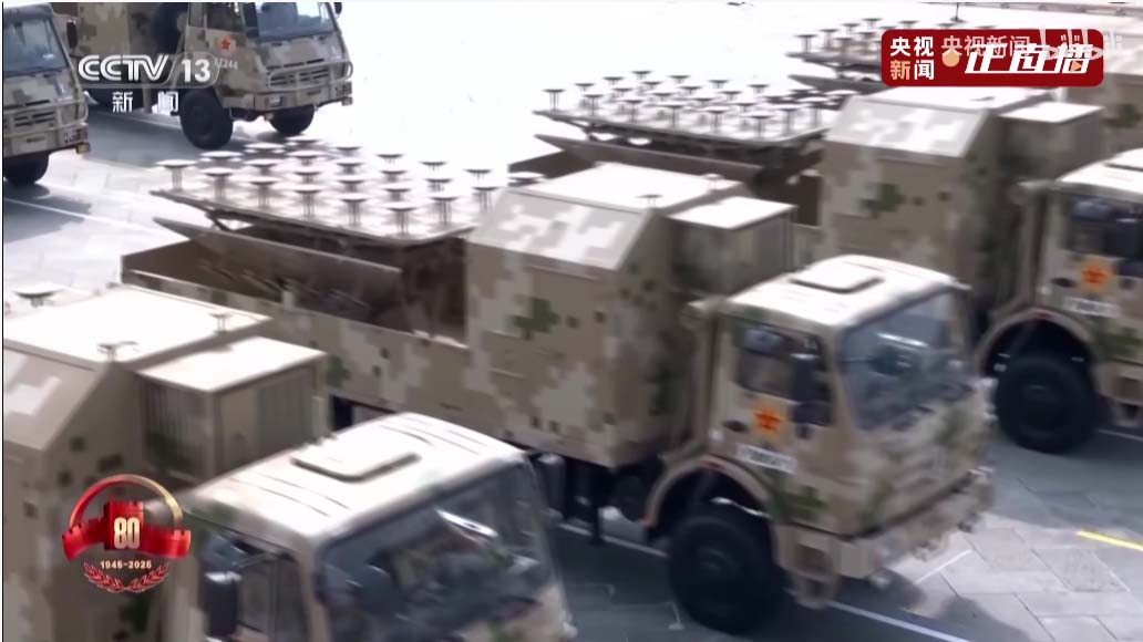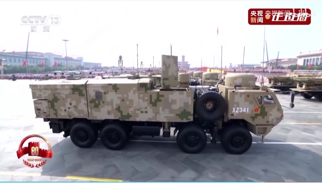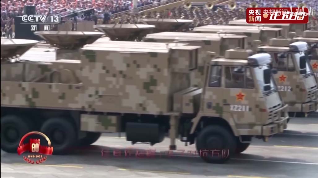 接下来是电子对抗编队,头顶锅盖是卫星干扰,头顶圆柱的是全向干扰,头顶一片小树枝的那个天线可以竖起来,是相控阵定向干扰。
