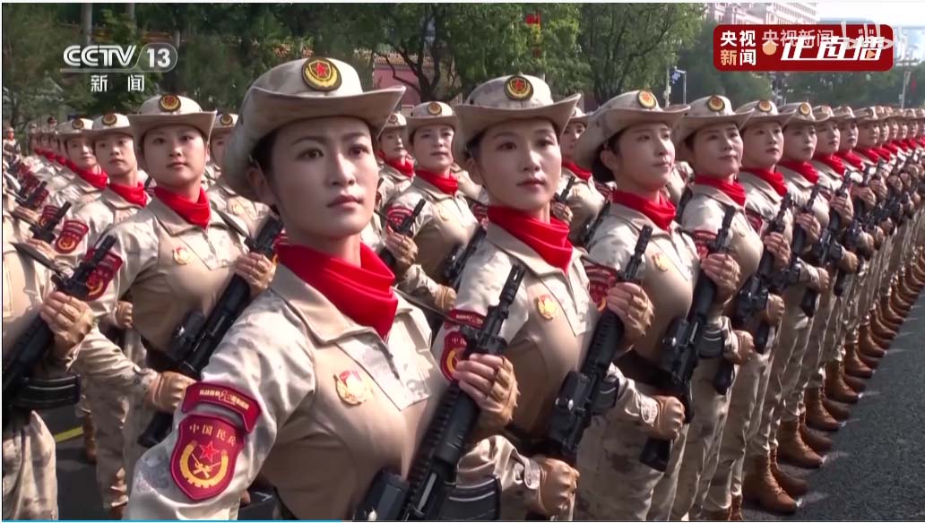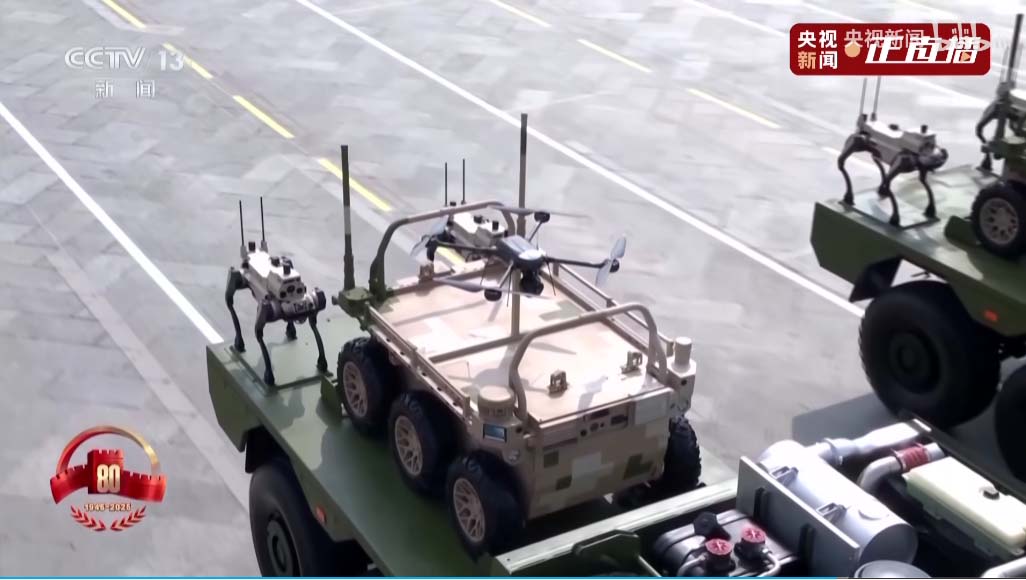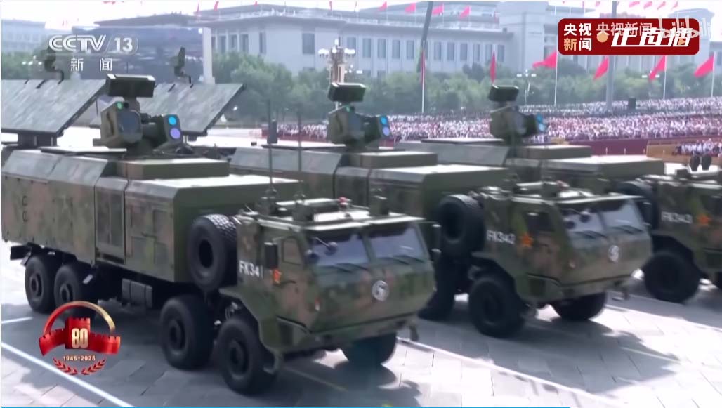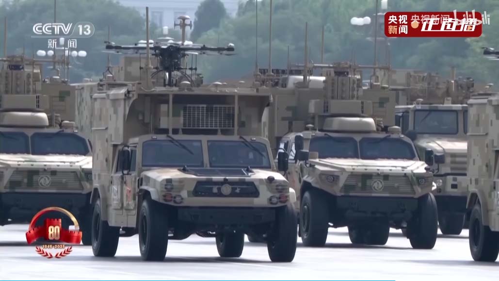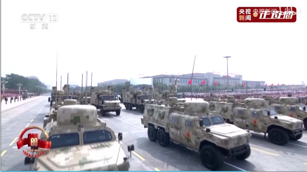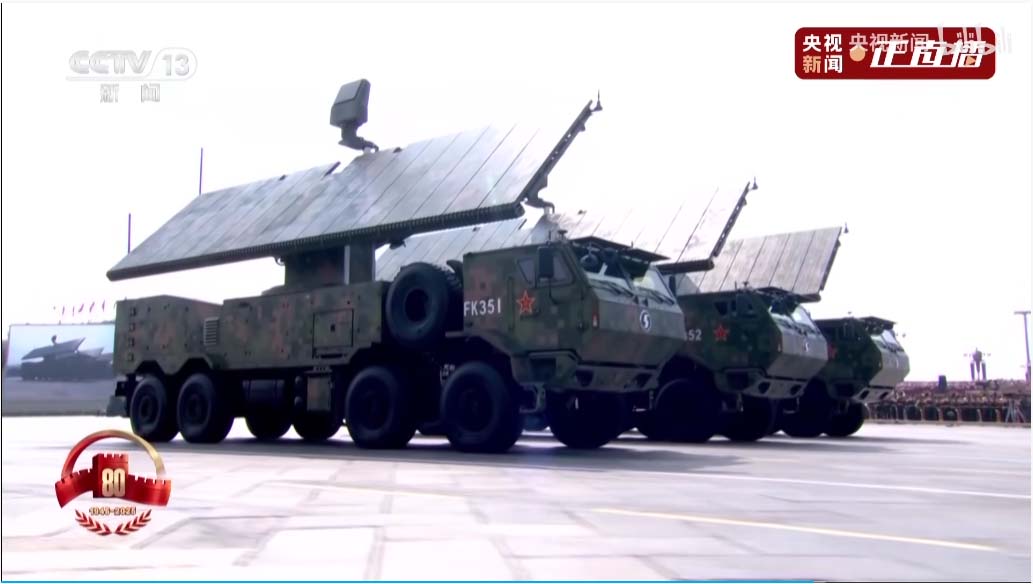 接下来是电子对抗编队,头顶锅盖是卫星干扰,头顶圆柱的是全向干扰,头顶一片小树枝的那个天线可以竖起来,是相控阵定向干扰。