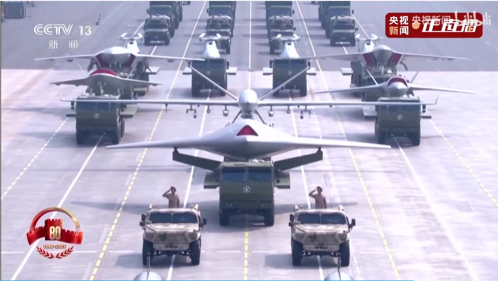 无人机编队,除直升机外,展示了六种不同类型固定翼无人机,不仅有攻击机,察打一体机,僚机,还有制空机……疯了……