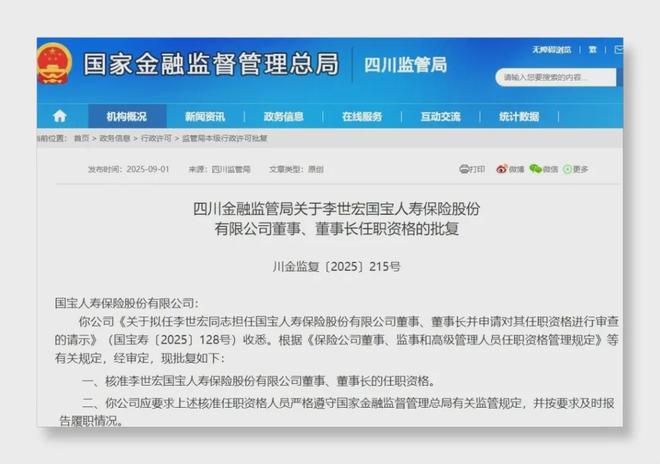 近日,一则重磅消息在四川保险领域引发广泛关注:国家金融监督管理总局网站于9月1日显示,李世宏担任国宝人寿保险股份有限公司董事、董事长的任职资格已获核准通过。这一任命不仅标志着国宝人寿迎来第四任董事长,更意味着四川首家全国性寿险机构首位“女掌门”正式走马上任,开启全新发展篇章。