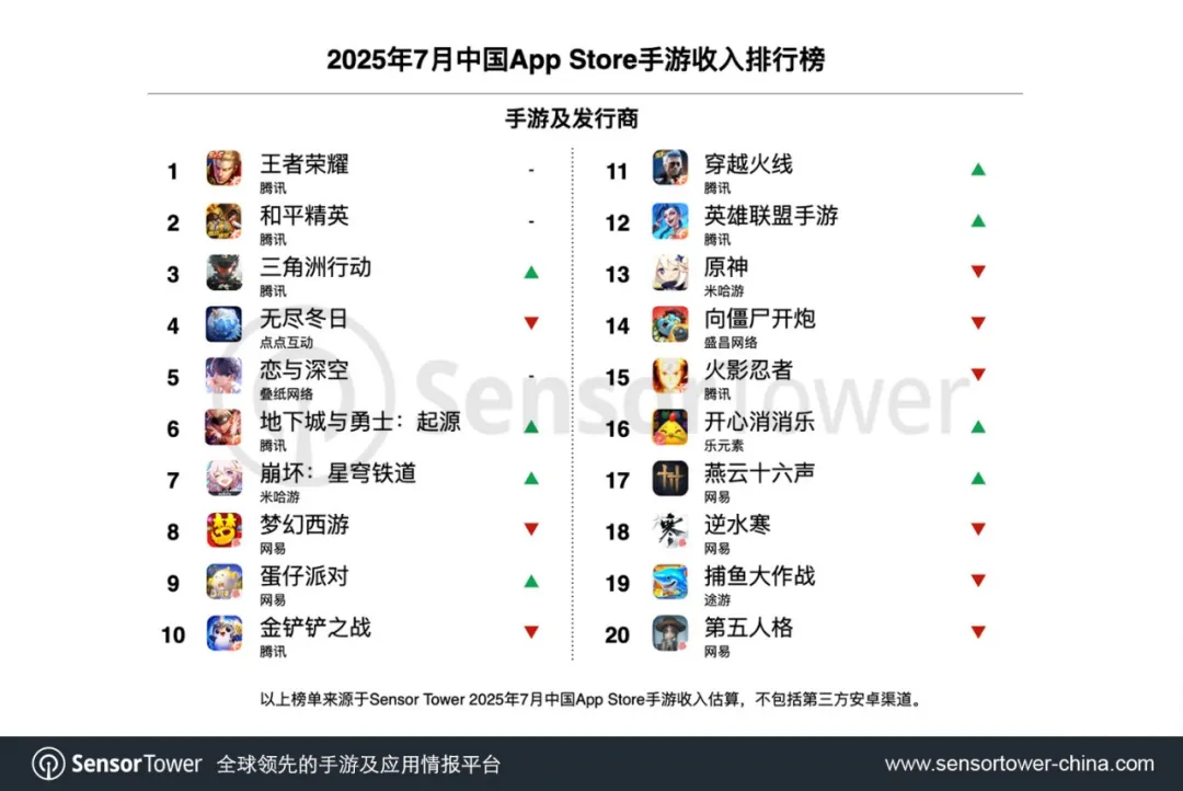 Sensor Tower称,米哈游《崩铁》迎来全新3.4版本“因为太阳将要毁伤”,随着限定5星角色“白厄”“Saber”和“Archer”的登场,游戏在7月2日至3日连续登顶全球手游畅销榜,7月收入暴涨325%,创2025年以来新高,带动米哈游本期收入劲增28%,稳居发行商收入榜第4名。