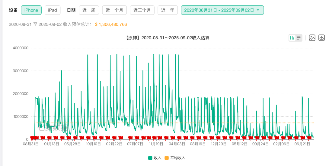 在这一大环境下,《原神》的表现的确有些差强人意。七麦数据显示,从2020年9月推出至今,《原神》iPhone端的收入在2023年4月中旬开始下滑。