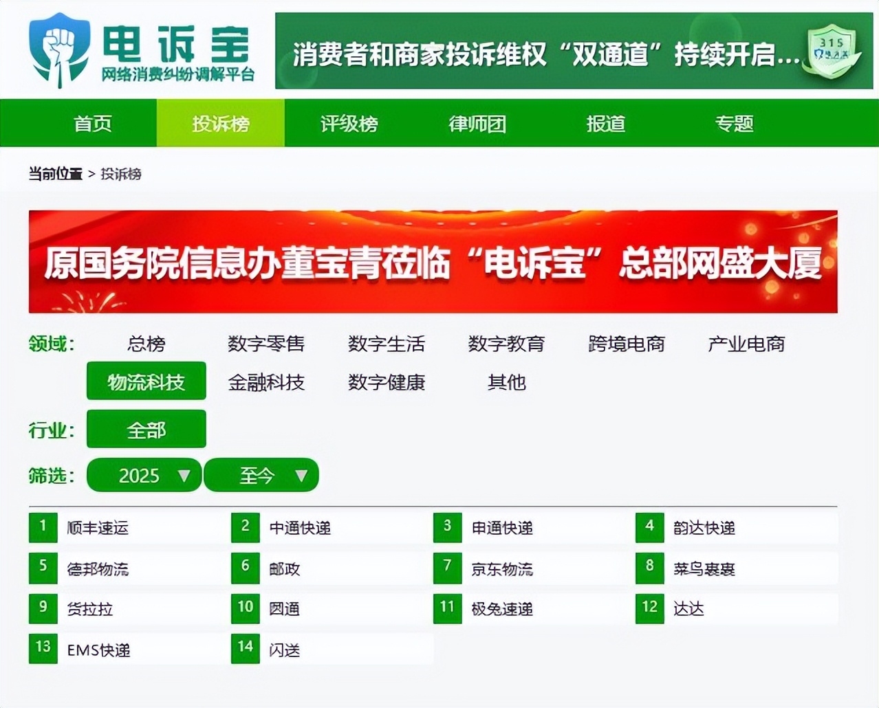 据网络消费纠纷调解平台网经社“电诉宝”2025年至今受理的中国物流科技领域用户有效投诉显示,入选投诉榜的依次为:顺丰速运、中通快递、申通快递、韵达快递、德邦快递、邮政、京东物流、菜鸟裹裹、货拉拉、极兔速递、圆通、极兔速递、达达、EMS快递、闪送。