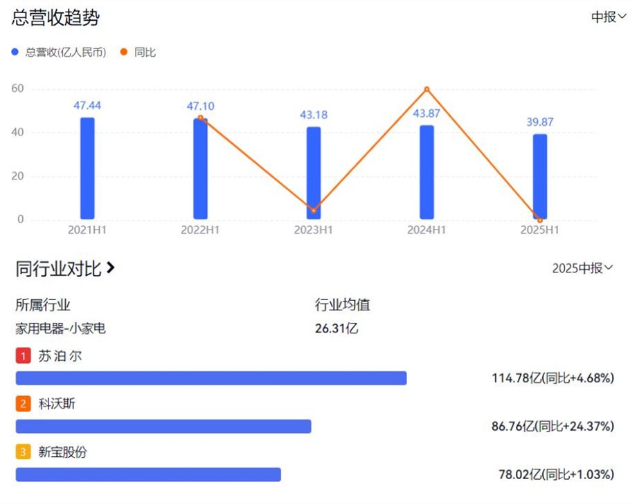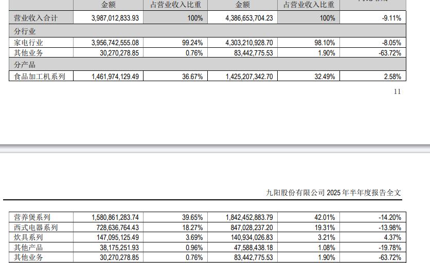 近日,九阳股份发布了2025年半年报,报告期内,公司实现营收39.87亿元,同比下降9.11%,实现净利润1.23亿元,同比大降30.02%,其中二季度公司实现营收19.87亿元,同比下降14%,实现净利润0.21亿元,同比下降53%。