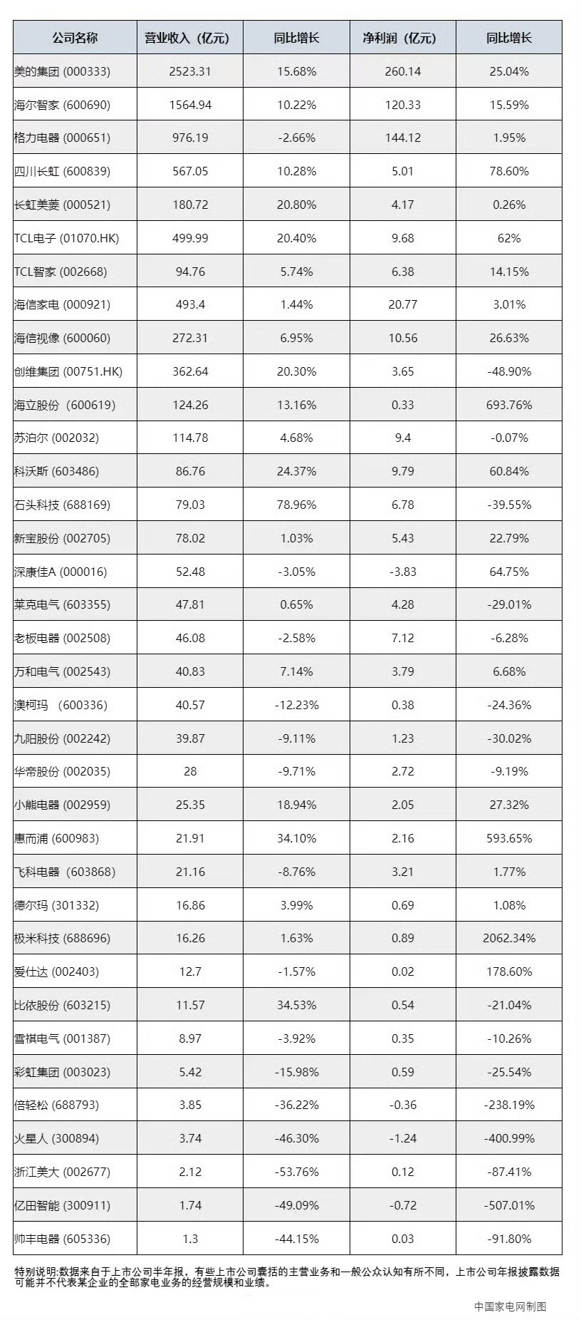 不过如果将视线扩展到整个家电圈的上市企业,来统览2025年中报的业绩表现的话,实际上大家会发现,九阳的业绩也没有显得有多“惨”,从中国家电网统计的业绩排行榜来看: