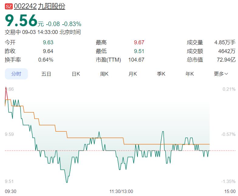 截至9月3日14:33,九阳股份(下称:九阳)报9.56元,较2020年以前复权方式计算的42.88元最高点,仍跌去近78 %。