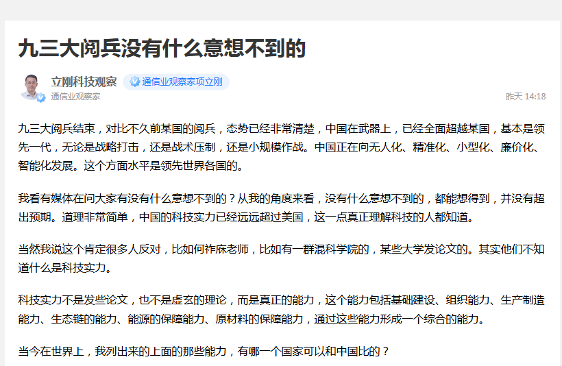 昨天,项立刚写了《九三大阅兵没有什么意想不到的》文章,我完全赞同项立刚对九三阅兵的基本判断。阅兵式结束后,我抑制不住兴奋的心情,也写了一篇关于如何看待此次大阅兵的文章,题目是《九三阅兵的伟大意义:从战略防守到战略相持的里程碑》。在我看来,这次大阅兵意义非凡,标志着中国在与某国的博弈中,实现了从过去被动防守到如今更具主动性和坚定立场的重大转变,堪称具有里程碑式的意义。有些媒体平台对我的文章有所顾虑,我认为大可不必。我们是社会主义民主国家,鼓励百花齐放,百家争鸣,每个人都可以充分表达自己的观点和看法。以下是我的征文: