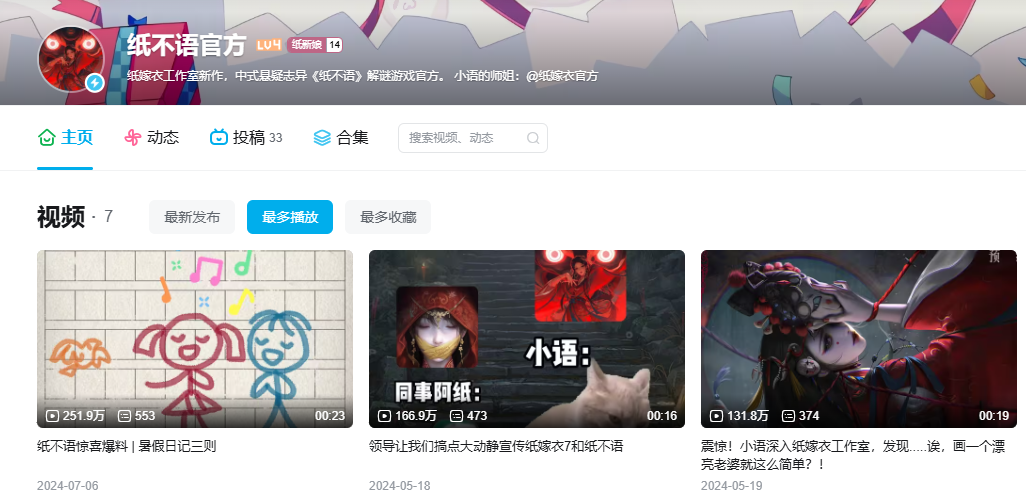 2024年年中,从纸嫁衣衍生而出的《纸不语》系列与纸7做了同步宣发。得益于原IP的极大影响力,《纸不语》从面世之初就关注拉满,相应的爆料视频动辄就是百万以上的播放量级。
