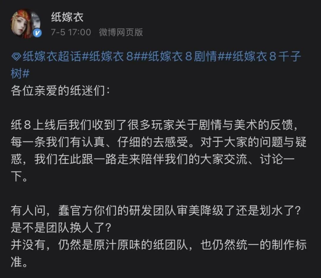 不过这样的揣测倒也没持续太久,游戏正式上架的第二天,纸嫁衣团队就对大量负面反馈做出了集中回应,关于角色的立绘、人设以及故事的剧情发展、文化内核等诸多产生争议的内容进行解释和声明,并同步了后续的大致改进方案。