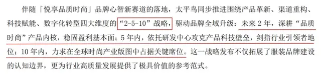 面对业绩压力,太平鸟在2025年确立了“悦享品质时尚”的新定位,并启动了“2-5-10”战略升级计划。该战略旨在通过聚焦产品内核、科技壁垒和全球布局,推动品牌向“品质时尚”转型。