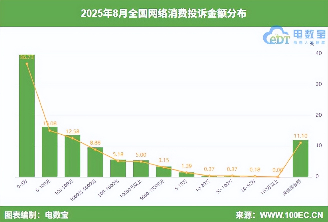 据“电诉宝”显示,8月投诉金额分布主要集中在0-5万(36.73%)、0-100元(15.08%)、100-500元(12.58%)、1000元-5000元(8.88%)、500-1000元(5.18%)、10000元以上(5.00%)、5000-10000元(3.15%)。