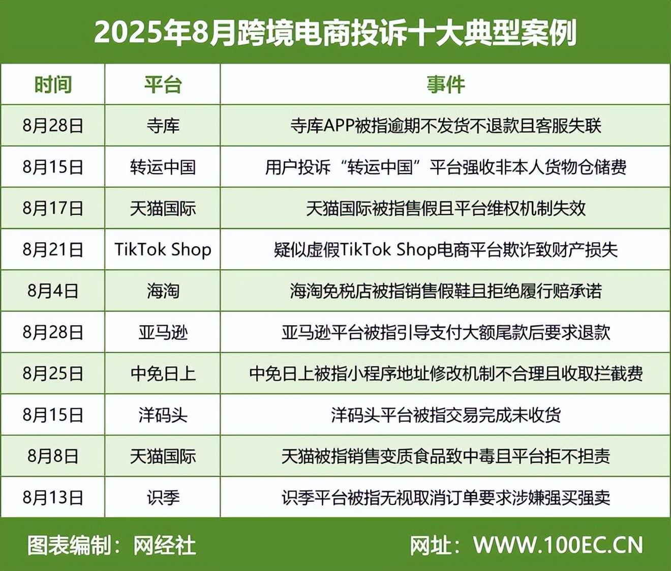 在跨境电商消费领域,据“电诉宝”受理用户维权案例,我们从中选取十大典型投诉案例,涉及寺库、转运中国、天猫国际、TikTok Shop、海淘、亚马逊、中免日上、洋码头、识季。