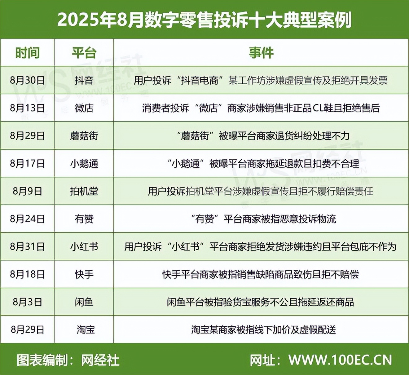 报告涉及了数字零售、生活服务电商及跨境电商三大板块。公布了8月网络消费投诉数据及《2025年8月数字零售十大典型投诉案例》《2025年8月生活服务电商十大典型投诉案例》和《2025年8月跨境电商十大典型投诉案例》。