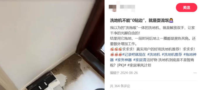 这“一臂之力”,解决了洗地机行业的一大痛点——“边角盲区”。那最后一厘米的边角水渍,如同房间里的“大象”,曾一度让用户对洗地机感到失望,却又似乎始终被整个行业视而不见。以至于有网友曾在社交平台发帖吐槽,“洗地机不能0贴边,就是耍流氓”。