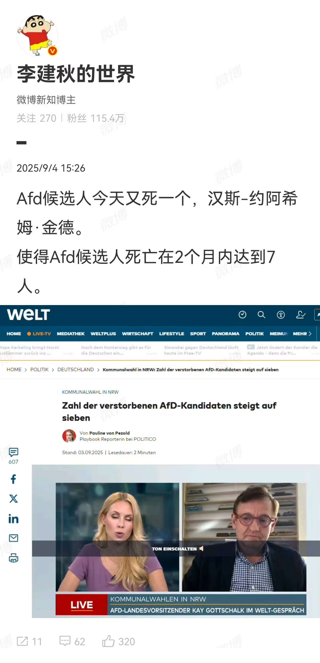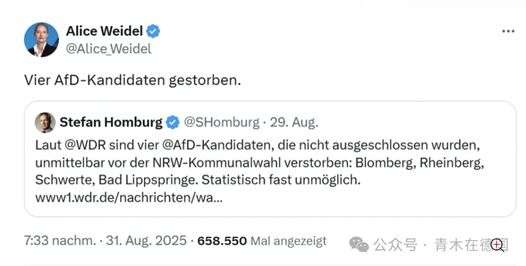 这则帖文也获得德国选择党联合领导人爱丽丝·魏德尔的转发。她还写道:四名候选人死亡。许多网友质疑连续这么多名候选人去世,而且是德国选择党的候选人。