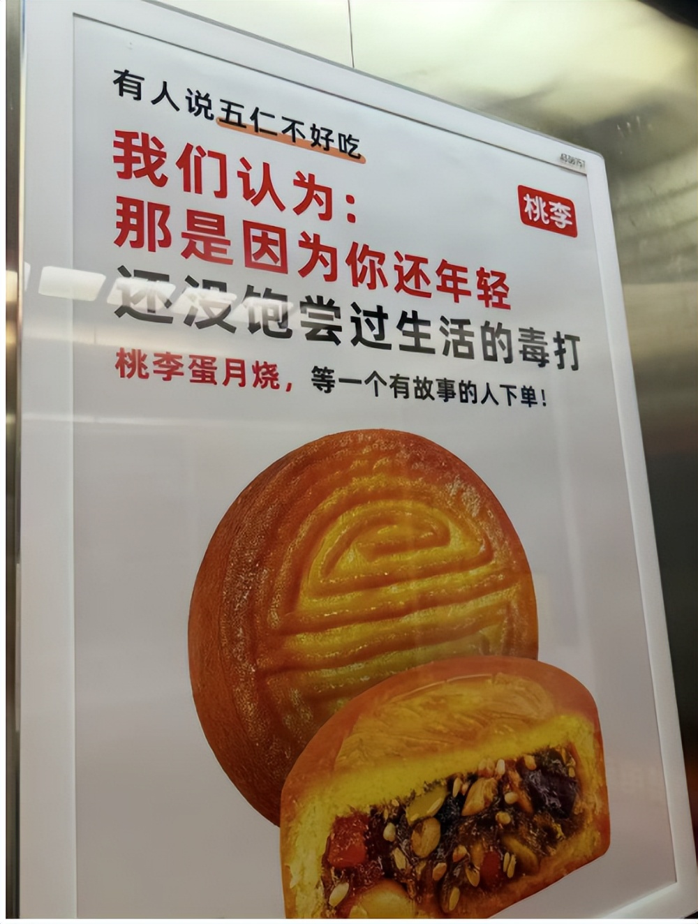 近日,桃李面包(603866.SH)一则电梯广告文案引发争议。社交平台上流传的图片显示,桃李蛋月烧产品的广告语写道:“有人说五仁不好吃,我们认为:那是因为你还年轻,还没饱尝过生活的毒打。”