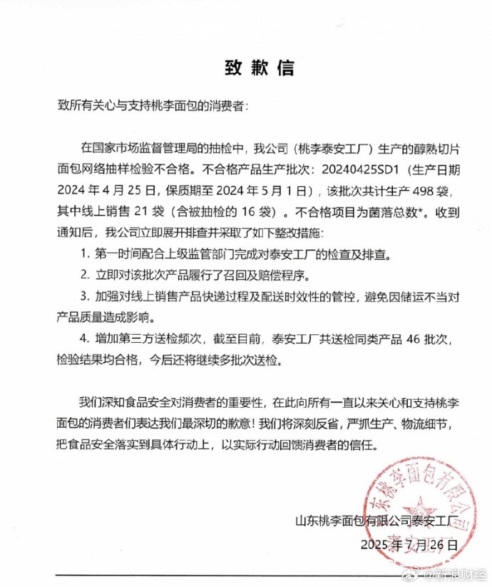随后,桃李面包就此事在官网发布《致歉信》。其称,公司立即展开排查并采取了整改措施。还将深刻反省,严抓生产、物流细节,把食品安全落实到具体行动上。