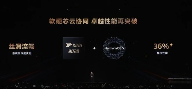 今日发布会上,华为常务董事、终端BG董事长余承东宣布为MateXTs非凡大师,搭载了全新麒麟9020处理器,并搭载HarmonyOS 5系统,可以带来**36%**的整机性能提升。
