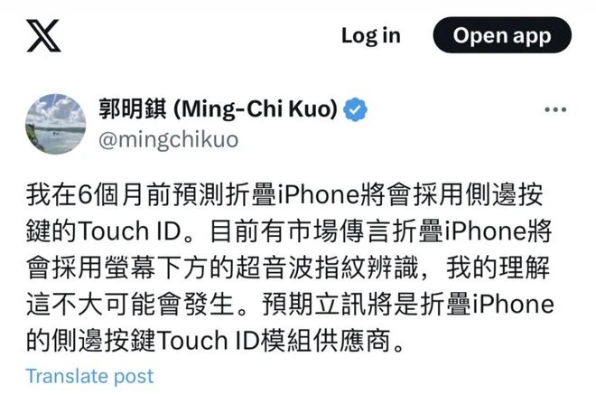 据知名分析师郭明錤表示,可折叠iPhone 将采用侧边按键Touch ID功能,而非之前网上有传言的屏下指纹识别。