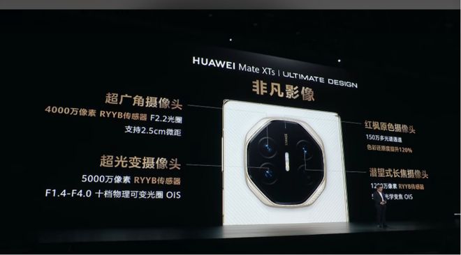 去年,华为Mate XT 非凡大师的影像配置已经相当豪华了:配备了一颗5000万像素主摄+1200万像素超广角+1200万像素潜望式长焦镜头的旗舰组合。